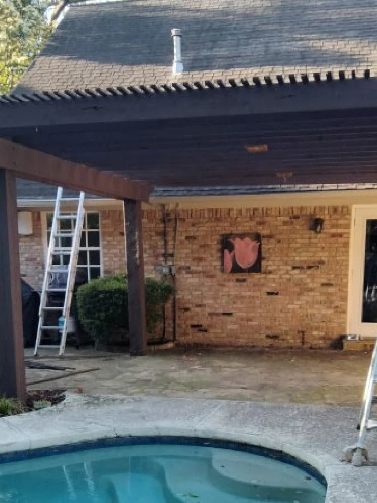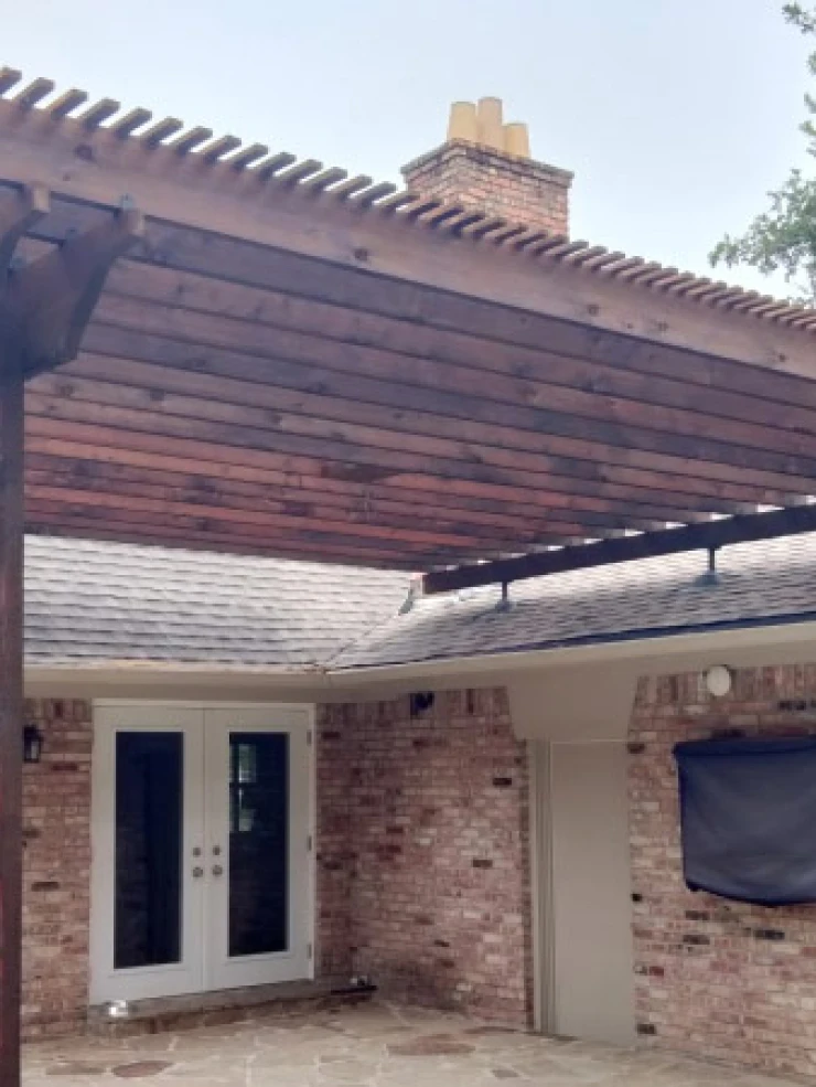 Old cedar Pergola was not attached to the roof properly and the wood was rotten. We discussed with the client their needs and expectations for the pergola renovation. A new 20’x20′ pergola was built using the new cedar. Our roofing contractors specialize in exterior renovation Plano. We serve in Plano and all surrounding areas. In this instance, it was Lake Highlands.